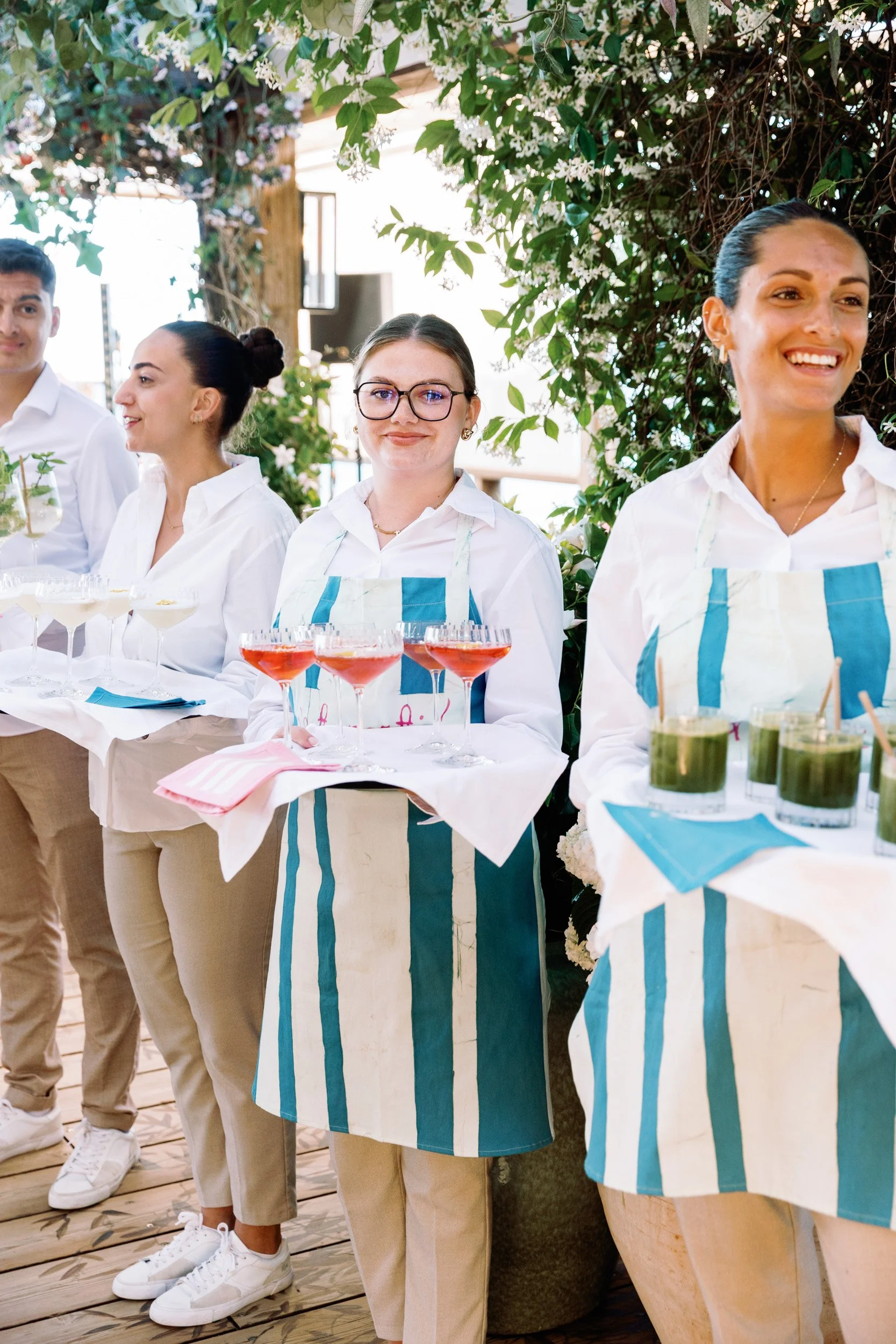 Annie and Valeria welcomed guests to Saint-Tropez with a chic seaside welcome party at Jardin Tropezina Beach Club. After a leisurely afternoon spent unwinding by the pool, guests arrived at the beach dressed to impress—Annie and Valeria setting the tone in striking style. Valeria wore a bespoke One Of hand-beaded chiffon top paired with silk trousers, a Khaore handbag, and Manolo Blahnik mules, while Annie chose a peplum gown by Markarian, styled with a matching bag and Staud mules.